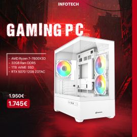 Gaming PC - Kasë Kompjuteri PC Sharkoon Gehäuse MK6 RGB Micro-ATX e bardhë, AMD Ryzen 7-7800X3D, 32GB RAM DDR5, 1TB nVME SSD, RTX 5070 12GB ZOTAC Twin Edge