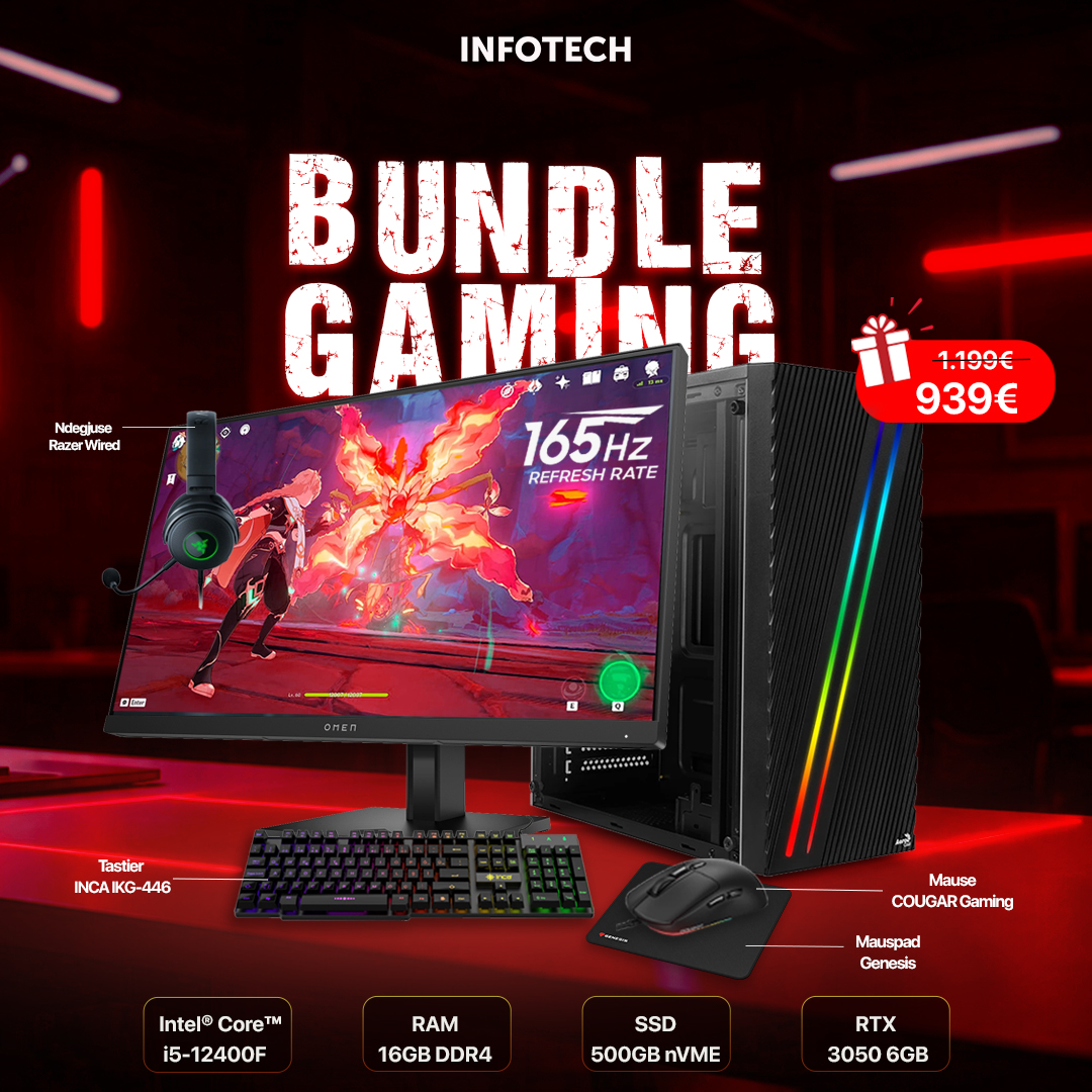 Bundle Gaming - Kasë PC AeroCool Midi Streak MicroATX ,Intel® Core™ i5-12400F, 16GB DDR4 , 500GB nVME SSD, RTX 3050 6GB INNO3D Twin X2, Monitor HP OMEN 24 23.8 165Hz,COUGAR Gaming Maus + Kufje Razer Wired +INCA Gaming Keyboard RGB IKG-446 +Genesis Maus