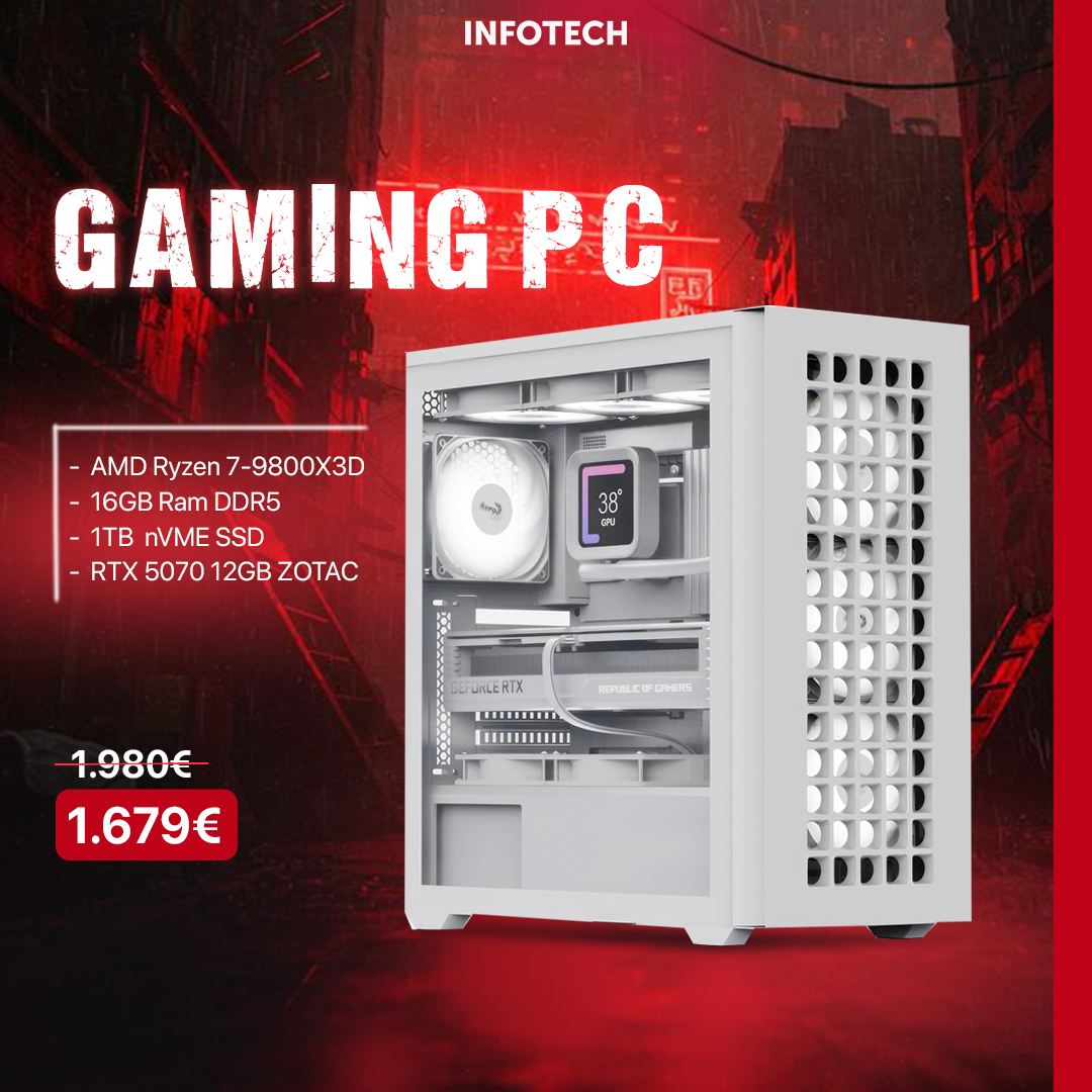 Gaming PC - Kasë Kompjuteri PC AeroCool Geh Midi D502A-G-WT-V1, AMD Ryzen 7-9800X3D, 16GB RAM DDR5, 1TB nVME SSD, RTX 5070 12GB ZOTAC