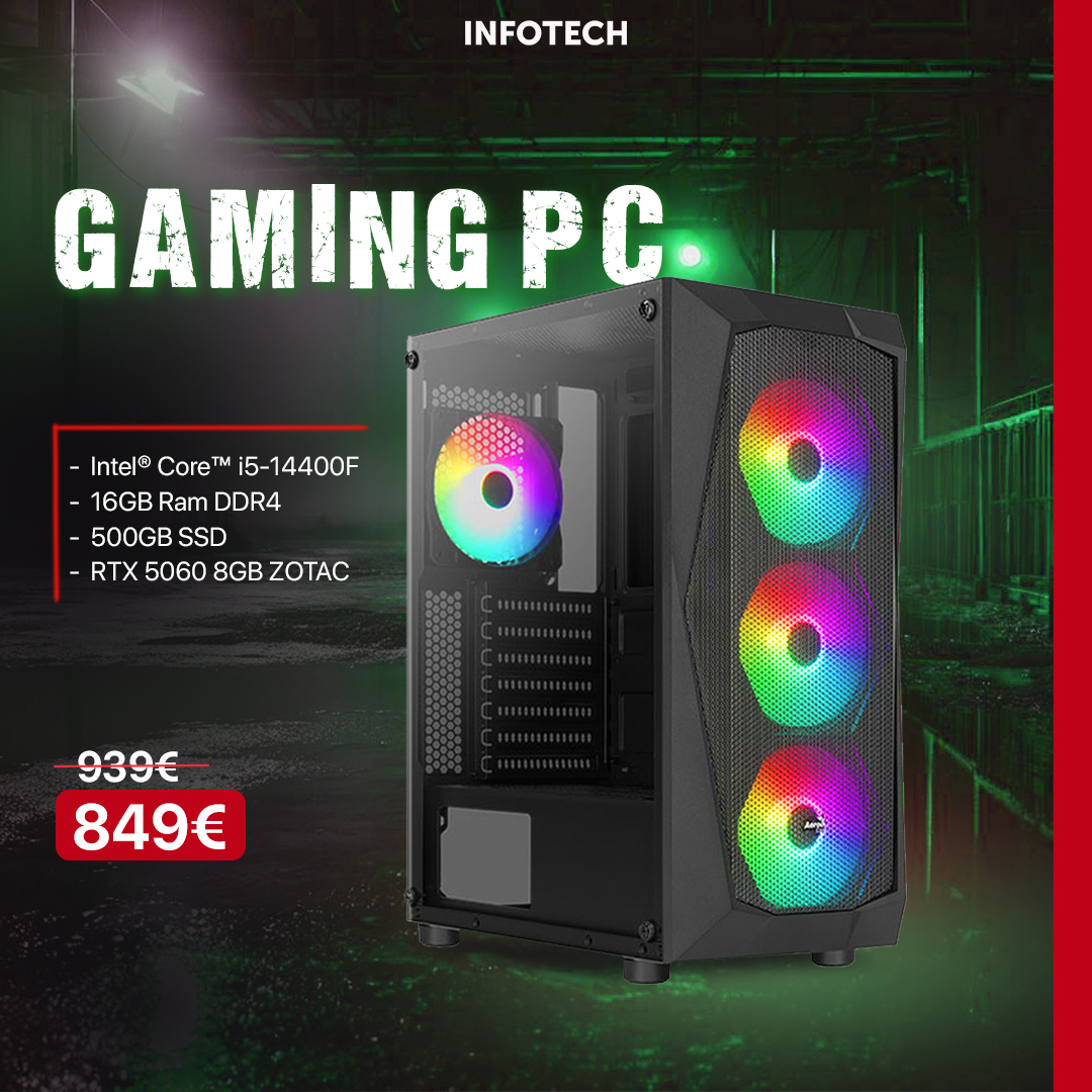 Gaming PC - Kasë Kompjuteri PC AeroCool Geh Midi Falcon-G v2, Intel® Core™ i5-14400F, 16GB RAM DDR4, 500GB SSD, RTX 5060 8GB ZOTAC SOLO