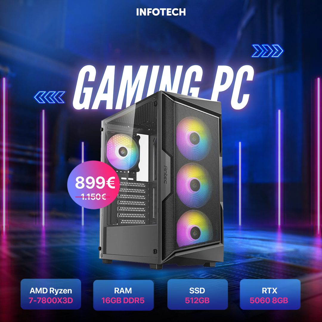 Gaming PC - Kasë Kompjuteri PC Antec Geh Mid AX61 Elite, AMD Ryzen 7-7800X3D ,16GB Ram DDR5 , 512GB SSD , RTX 5060 8GB ZOTAC SOLO