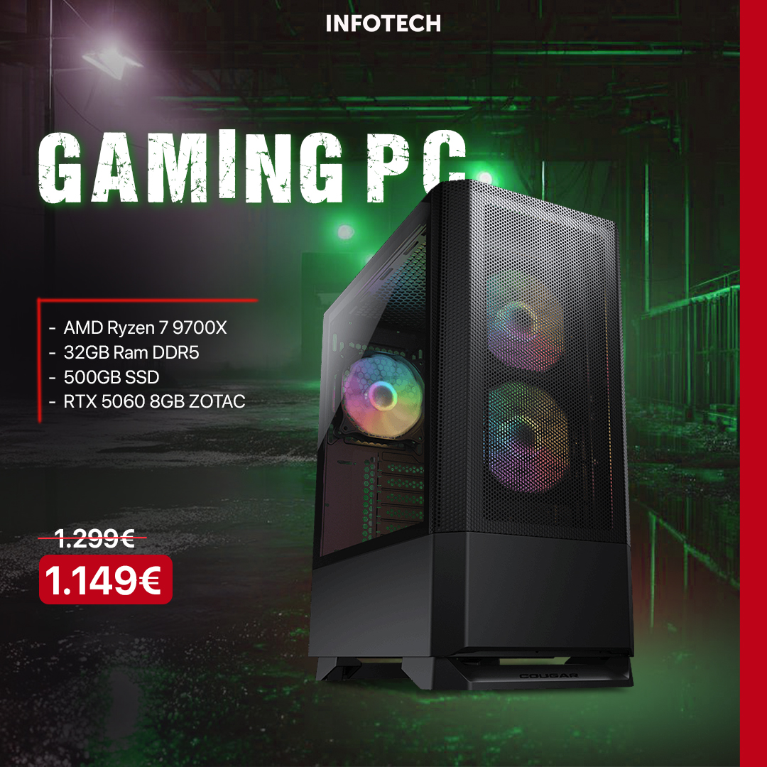 Gaming PC - Kasë Kompjuteri PC COUGAR Gehause Midi-Tower MX430 Air ARGB, e zezë,AMD Ryzen 7 9700X, 32GB RAM DDR5, 500GB SSD, RTX 5060 8GB ZOTAC SOLO